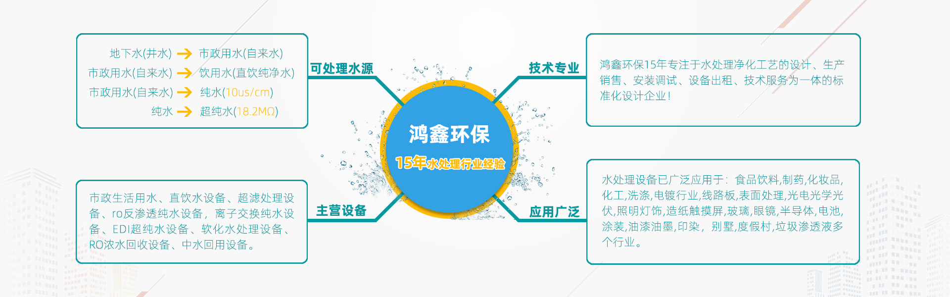 鴻鑫環(huán)保專業(yè)定制:市政生活用水處理設備、直飲純凈水設備超濾水處理設備、ro反滲透純水設備,離子交換純水設備、EDI超純水設備、軟化水處理設備、RO濃水回收設備、中水回用設備。